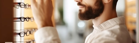 Unrecognizable bearded male customer touching eyeglasses while selecting optical eyewear in store, Generative AI