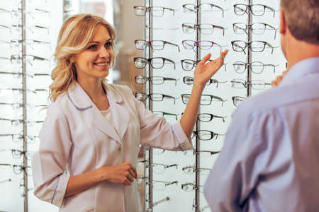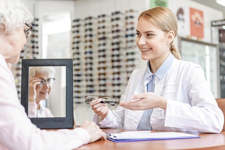 Professional salesperson helps a woman to choose reading glasses in an optometric shop.