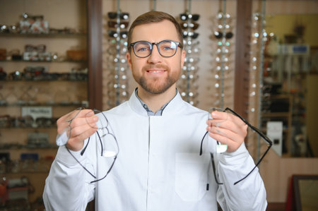Handsome ophthalmologist holding eyeglasses for a try out. Optometrist offering to wear a pair of glasses