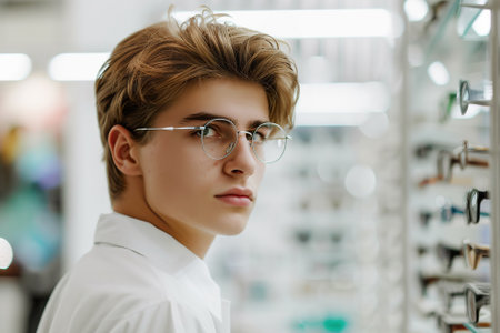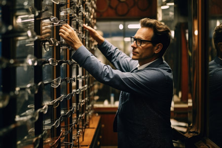 young man in suit and glasses looking at computer in hardware store, An ophthalmologist adjusts a frame on a frame in the hall of an optical store, AI Generated