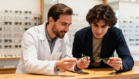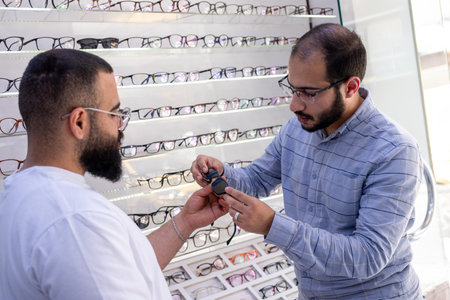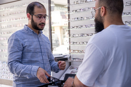 Male ophthalmologist showing pair of glasses to young man in optics store
