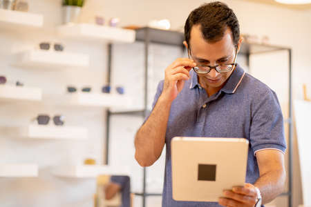 Indian man hold glasses leg and look over glasses to tablet look like he use as mirror to check his style.