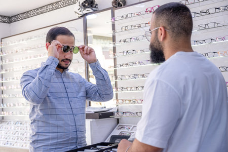 Male selecting the best eyeglasses, also selecting sunglasses which clip onto eyeglasses