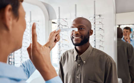 Quality eye care that keeps customers coming back. an optometrist examining her patients eyes with a pd ruler.