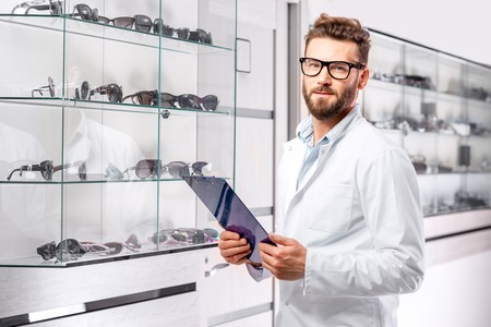 Handsome ophthalmologist with recipe in folder choosing a pair of eyeglasses. Optometrist checking the showcase with glasses in a the store or hospital.