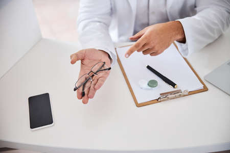 Close-up of optometrist holding messbrille in ophthalmology clinic