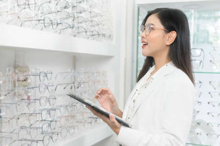 Asian man professional optician selling holding clipboard selective of glasses on shelves in optical shop. business sell eyeglasses.