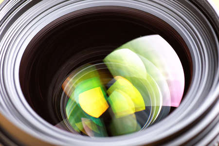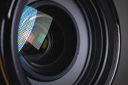 Camera lens close-up macro shot showing aperture blades. Media and photography concept background.