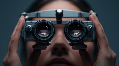 Caucasian female adult undergoing eye exam with optometry equipment.