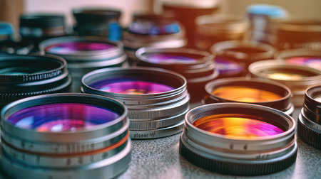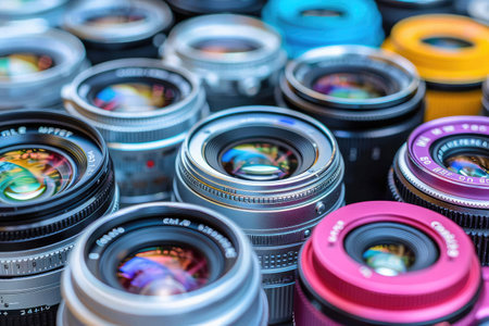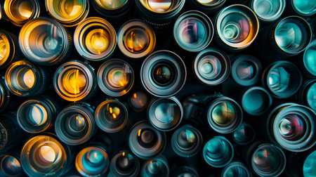 A stunning arrangement of various camera lenses showcasing colorful glass elements, ideal for photography enthusiasts and professionals seeking creative inspiration.