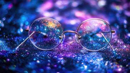 This stunning image features a pair of round glasses reflecting a vibrant galaxy filled with stars and cosmic colors against a sparkling background.