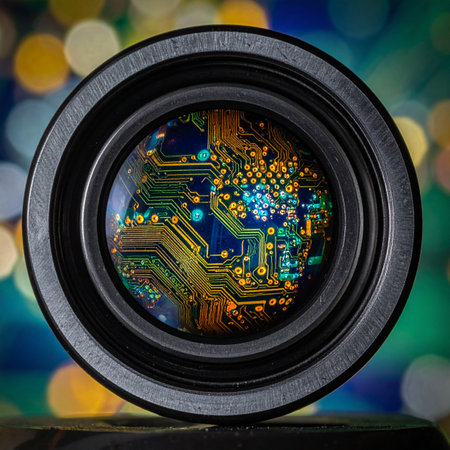 Discover vibrant optical effects and abstract bokeh with this stunning macro shot of a camera lens.