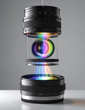 An exploded view of a modern camera lens reveals its complex inner workings. A beam of light passes through the precision-engineered glass elements, splitting into a vibrant rainbow spectrum.