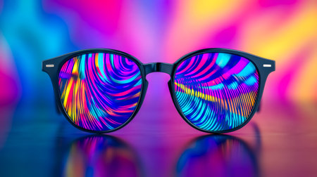 Sunglasses reflecting a colorful kaleidoscope pattern on a vibrant background