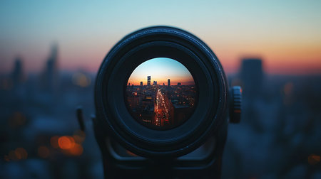 A stunning view of a city skyline captured through a camera lens at dusk blending nature and urban life.