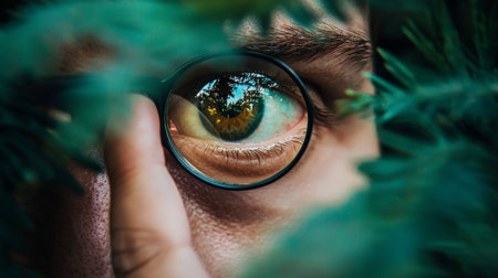 Close-up of an eye viewed through a magnifying glass surrounded by leaves, symbolizing observation, discovery, and curiosity.