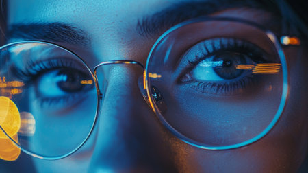 Intense close-up of a woman's eyes seen through glasses, with reflections of lights adding a futuristic feel. Ideal for concepts of vision, focus, and technology.