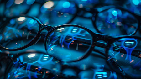 Array of blue glasses arranged with reflections and light effects, creating a futuristic, abstract aesthetic. Ideal for creative and design themes.