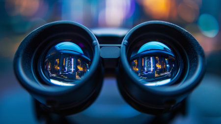 Binoculars reflecting cityscape at night representing concept of vision and exploration