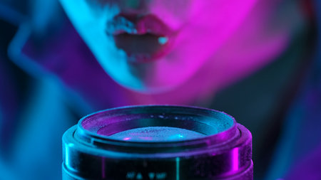 Close up of a camera lens with dust particles. In the background, blurred lips of a woman blowing on the dust, illuminated by bright neon lights, creating a modern and artistic atmosphere.