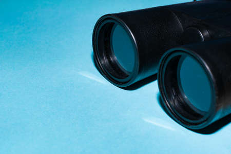 close-up detail of a binoculars glass, on a blue background. concept of travel, search and sighting of birds. small black binoculars for children. space for copying text.