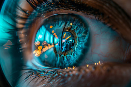 A detailed close-up of a human eye with reflections of lights and surroundings, highlighting intricate patterns and colors.