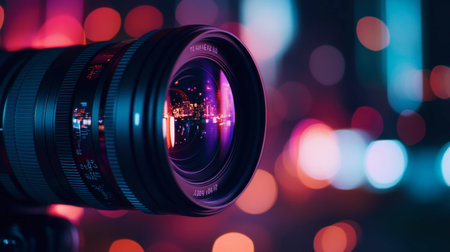 This close up view displays a camera lens with reflective surfaces, set against a backdrop of vibrant, blurred lights, creating a visually striking composition.
