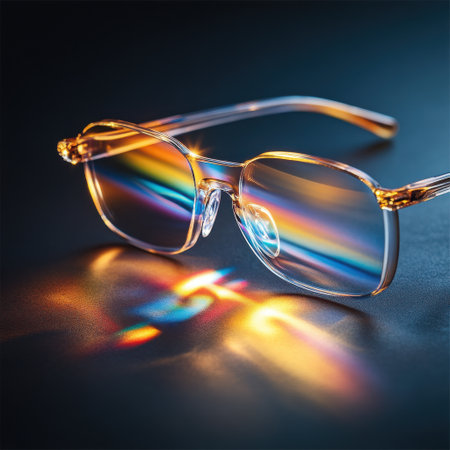 A pair of glasses with a rainbow effect on the lens. The glasses are on a dark surface, and the rainbow effect is created by the light reflecting off the lens