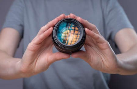man s hand holding professional digital camera lens. High quality beautiful photo concept