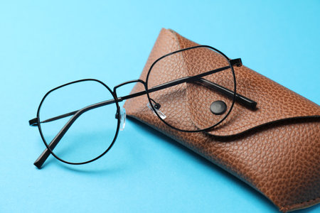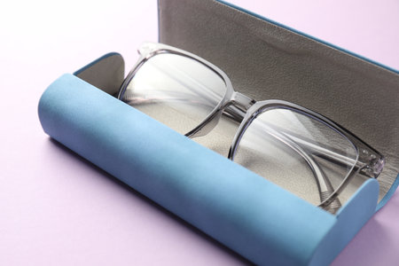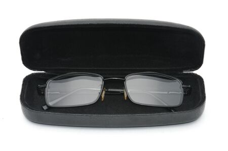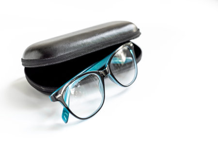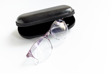 Transparent optical glasses with a eyeglass case on an isolated white background.