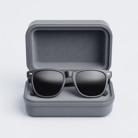 A pair of stylish black sunglasses rests in an elegant gray case, perfect for summer fashion and outdoor adventures. Ideal for casual or sophisticated looks.