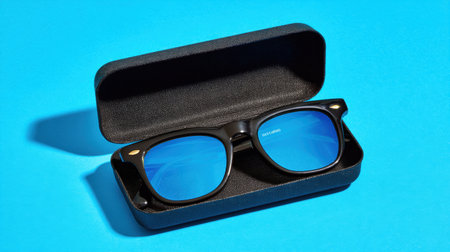 Sunglasses sit elegantly in a black case on a vivid blue surface, emphasizing their sleek design and vibrant blue lenses ideal for outdoor activities