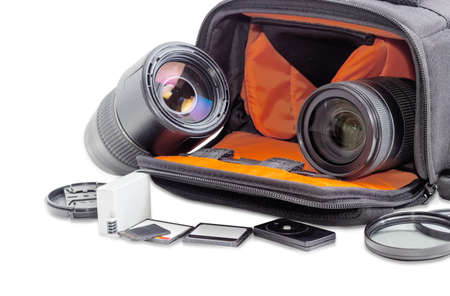 Fragment of the open camera bag with two different photo lenses closeup and some photo accessories in the foreground on a light background
