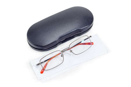 Modern pair of the classic men's eyeglasses in metal frame lying on the wipe and black hard plastic spectacle-case on a white background