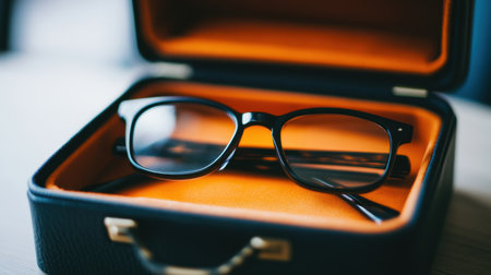 A pair of black eyeglasses rests in a luxurious case featuring a vibrant orange interior. This creative image emphasizes style and elegance in eye care.