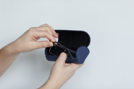 Glasses for sight and vision correction and protection from computer with ptotection case on the wooden table