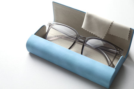 Case with stylish glasses and cleaning cloth on light background, closeup