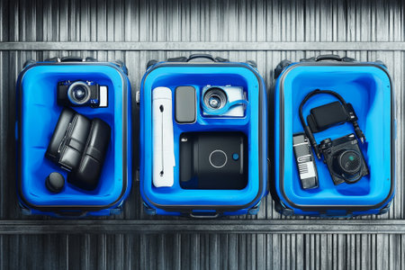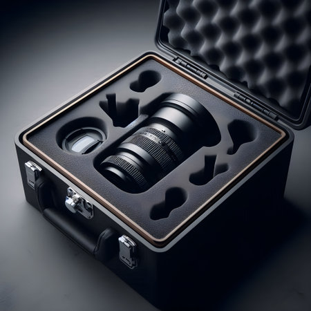 A dynamic arrangement of photography equipment and accessories displayed on a dark surface, showcasing vibrant details and modern design elements.
