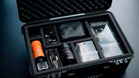 A camera bag open, revealing neatly organized lenses, batteries, and memory cards.