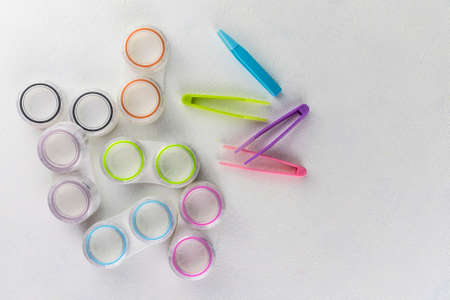 Lots of containers for contact lenses on a white background. Top view. Copy space.