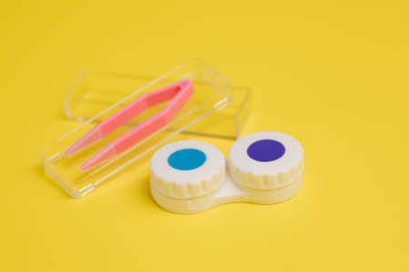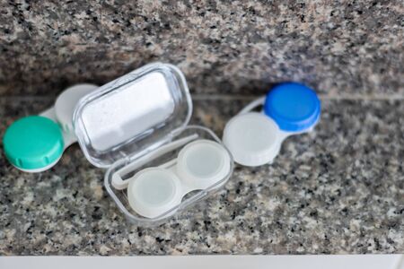 Contact lenses. Case close-up. Lenses are near. Poor vision, eye problems. Health and disease prevention concept.