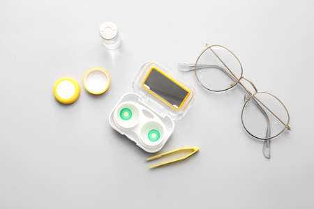 Accessories for working with contact lenses. Tweezers with contact lens and plastic container on gray background