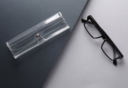 Eyeglasses with case on black and gray background. creative layout. minimalist composition. top view