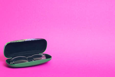 Glasses for vision in a metal frame on a case on a two-color background. Vision correction concept. top view.