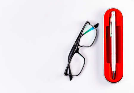 Top shot of an eye glass with a ball pen in box over white surface for historian and doctorate concept