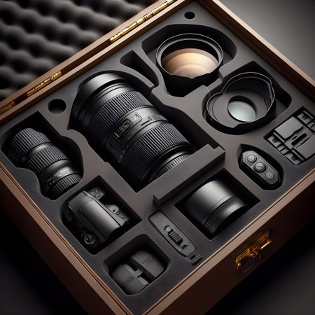 A visually appealing arrangement of various camera lenses and accessories on a dark surface, showcasing the intricate details and designs of each component.