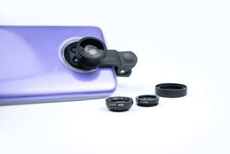 Phone photo lens with clips on white background. Extra macro camera for smartphone. Set of lenses wide angle, fish eye and macro