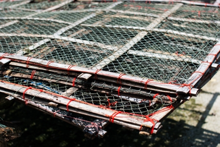 Lobster pots stacked up in rows on the quayside. Crab fishing background