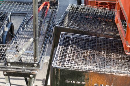 dirty cages used to catch large numbers of crabs in Mudeford Quay UK, sea creatures exploitaition, close shot with selective focus of lobster pots, vew from outside of the cage
