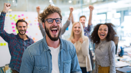 Energetic business team celebrating victory with joyous expressions and raised fists